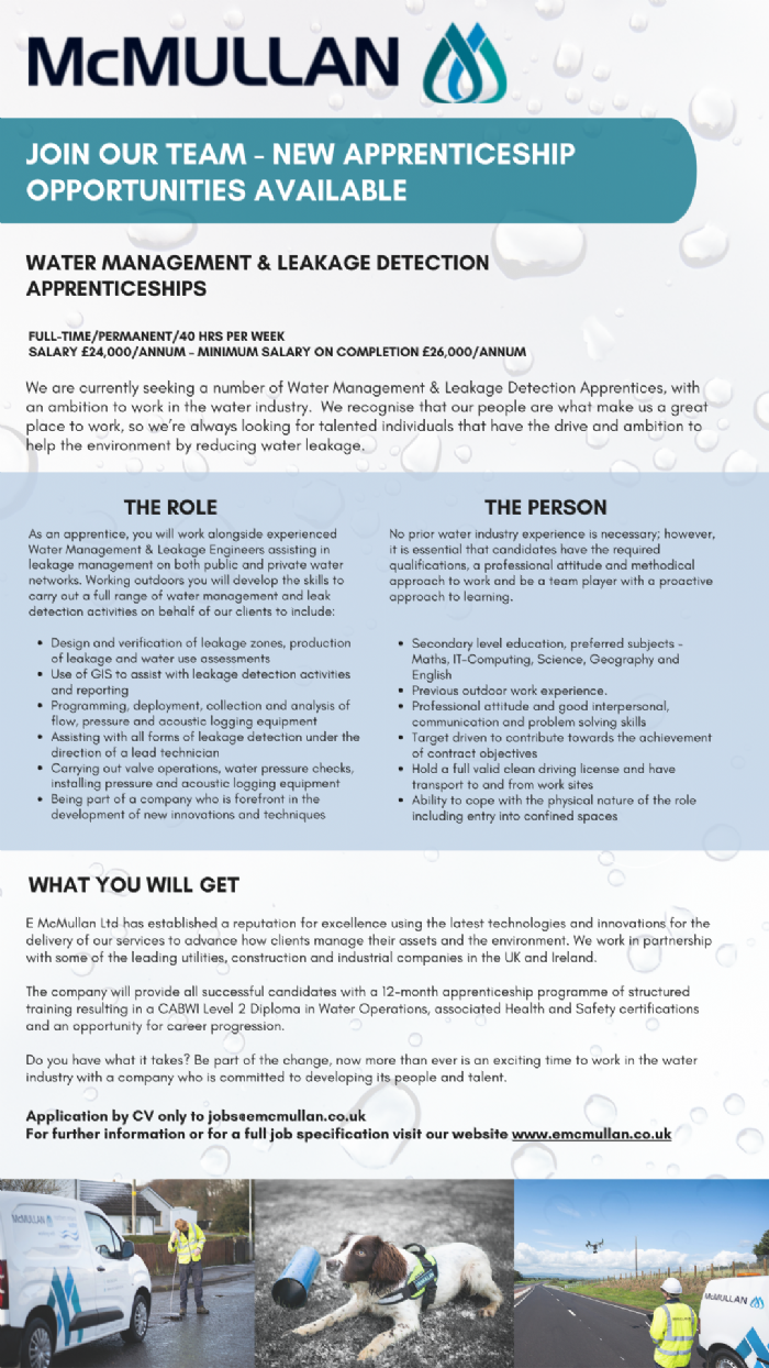 E McMullan Ltd are pleased to announce the launch of a new apprenticeship programme for Water Management & Leakage Detection Apprentices. The company will provide all successful candidates with a 12-month apprenticeship programme of structured training, resulting in the award of a CABWI Level 2 Diploma in Water Operations, associated Health and Safety certifications and an opportunity for career progression. This is a golden opportunity to gain entry to a career within the fast-developing water industry.